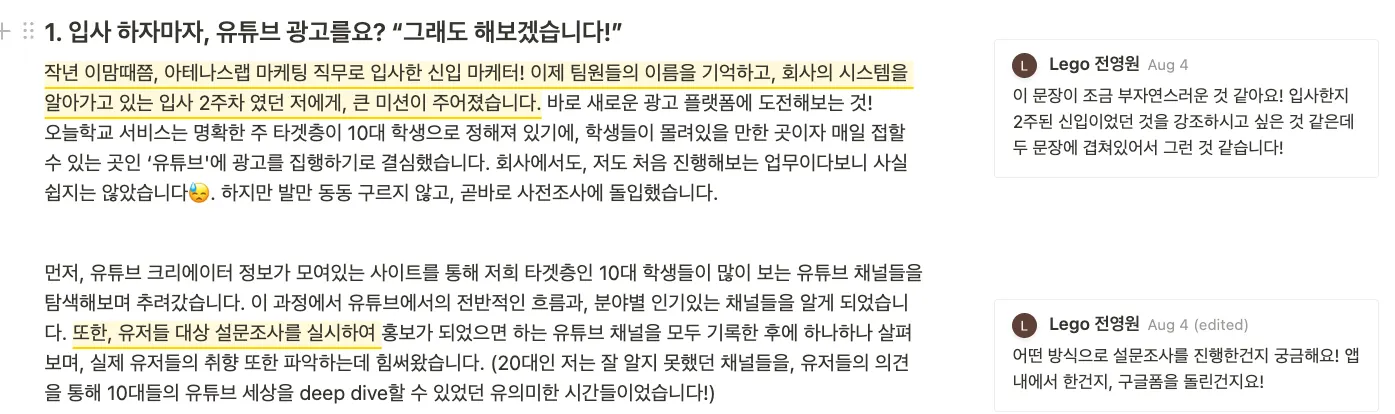 아테나스랩에서는 동료의 기술 블로그 글 피드백을 통해 나의 기술적 역량 및 글쓰기 실력을 향상할 수 있어요.