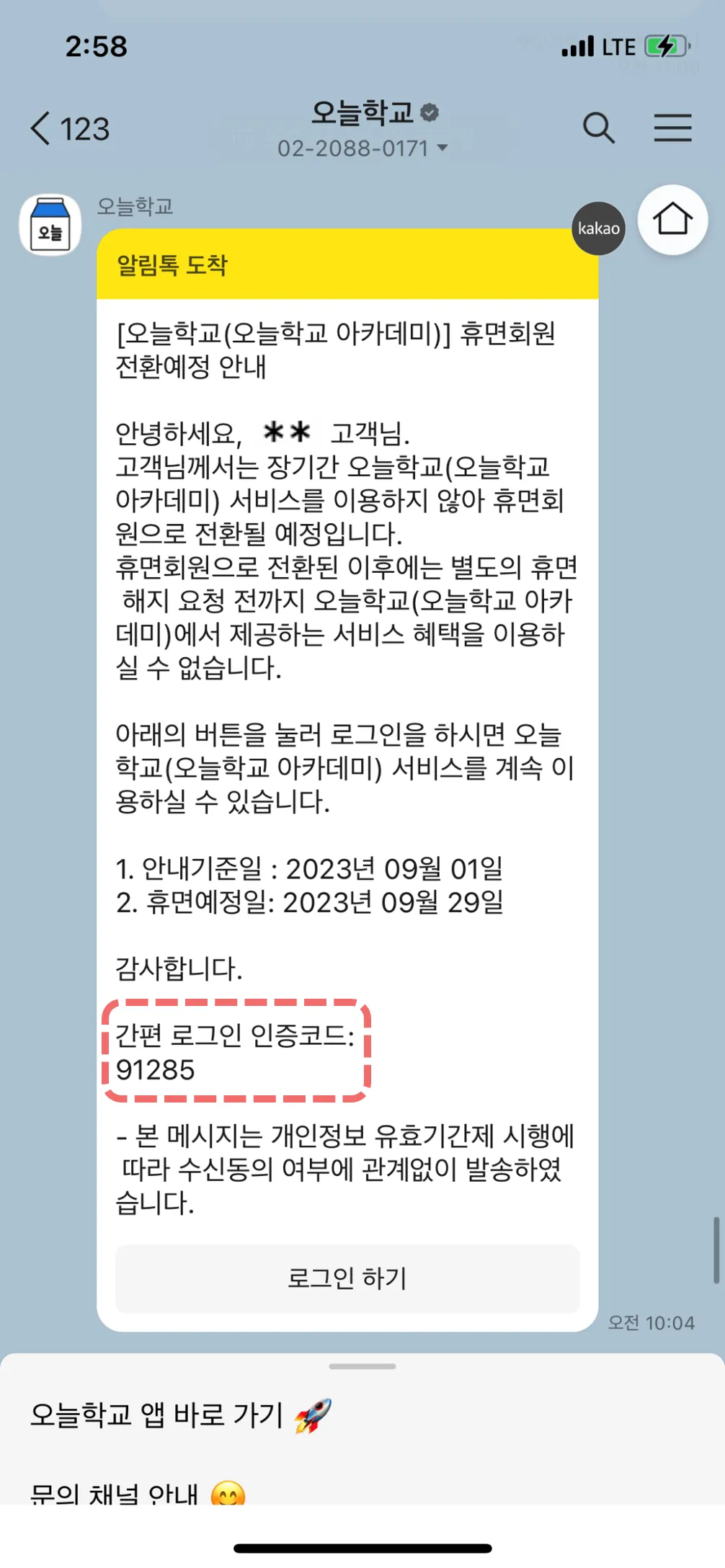 다만, 인증코드는 메시지를 받은 날짜로부터 7일간 유효하기 때문에 7일이 지나면 사용할 수 없어요. 인증코드의 유효기간이 지난 경우에는 오늘학교 아카데미 웹사이트 ( https://academy.prompie.com/ ) 에 접속해서 직접 오늘학교 계정으로 로그인하셔야 휴면 상태를 해지할 수 있어요.