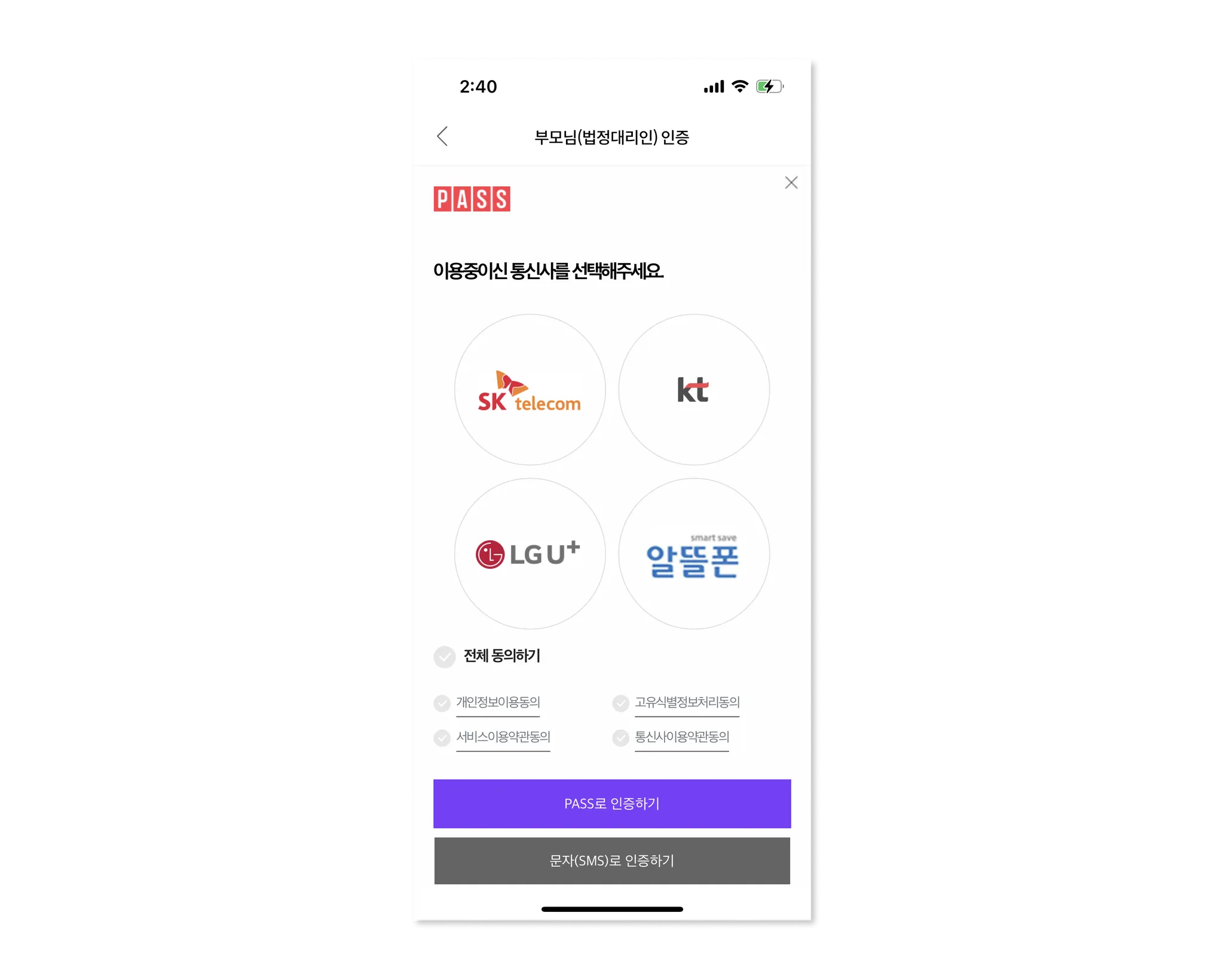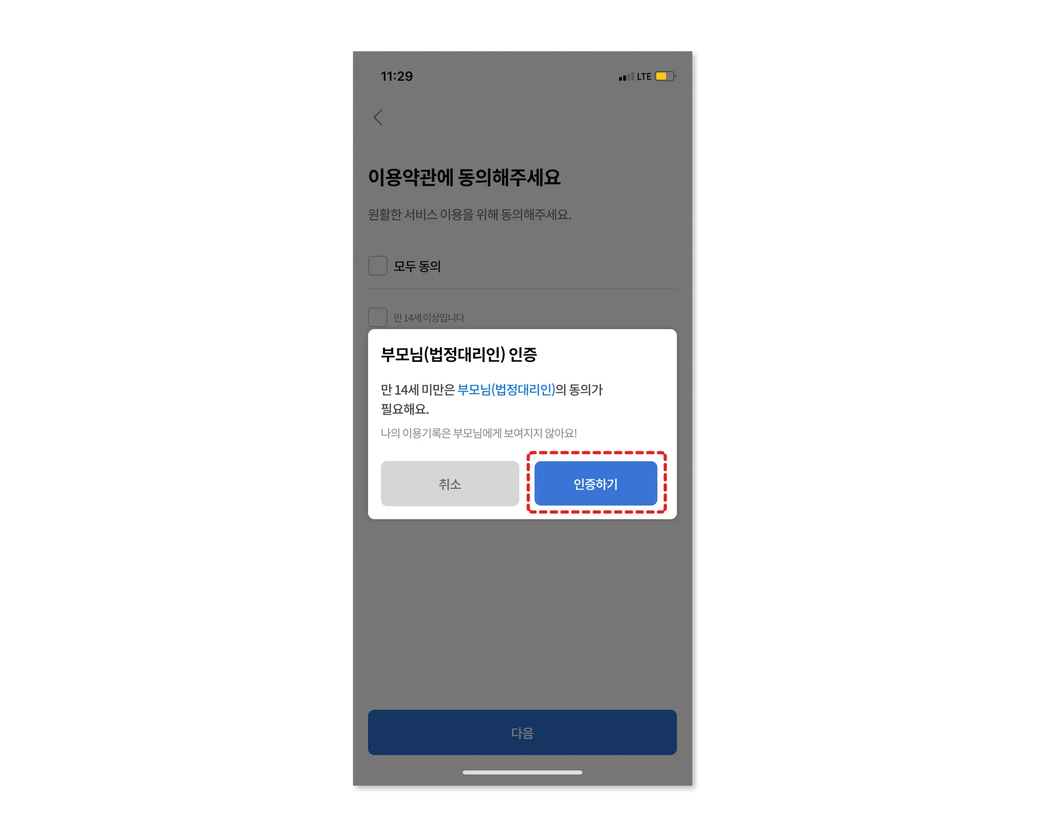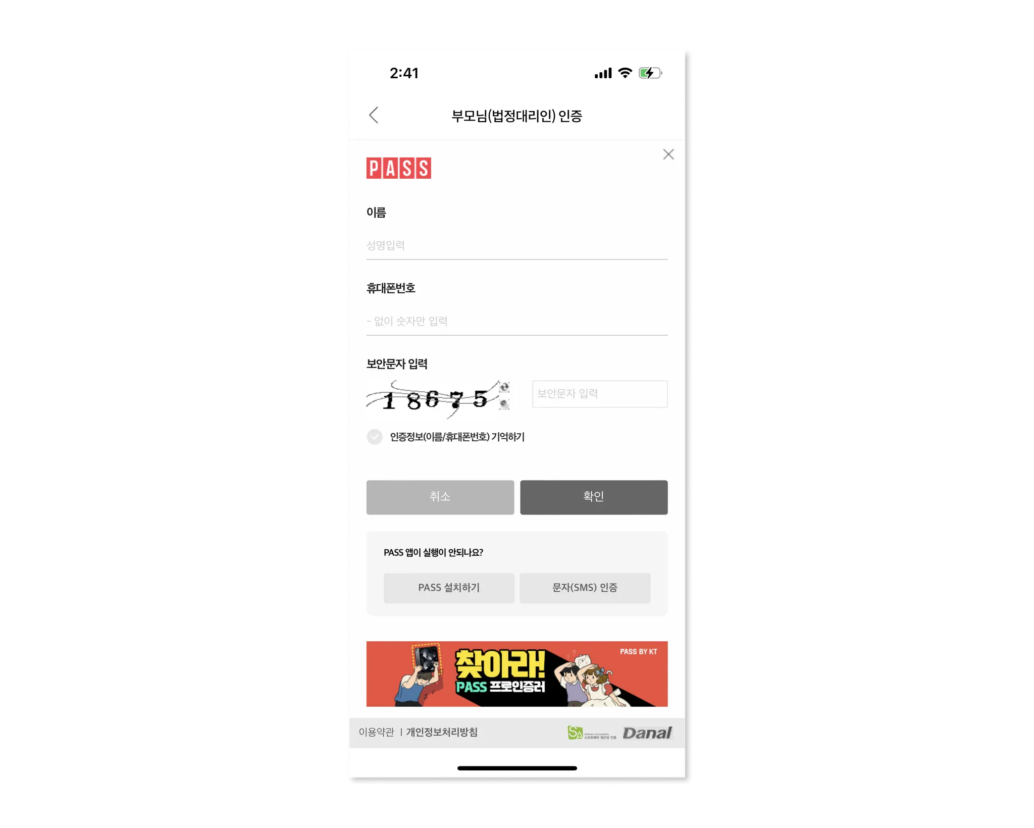 만 14세 미만 이용자님들은 PASS앱을 통한 본인인증이 불가능하기 때문에 다음의 절차대로 행하시면 본인인증 절차를 완료하실 수 있습니다.
