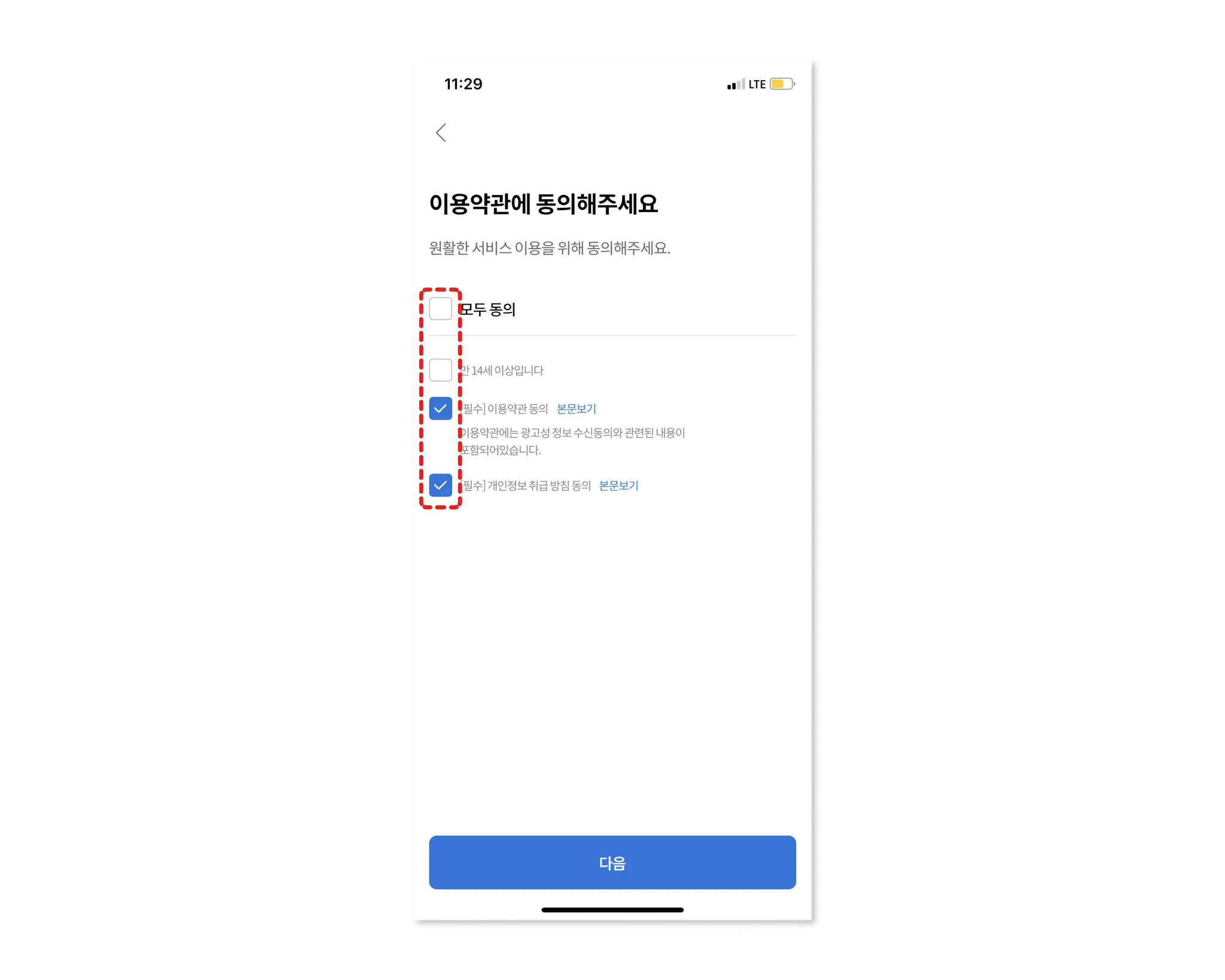 이용약관 페이지에서 아래 이미지처럼 [필수] 항목만 클릭하기