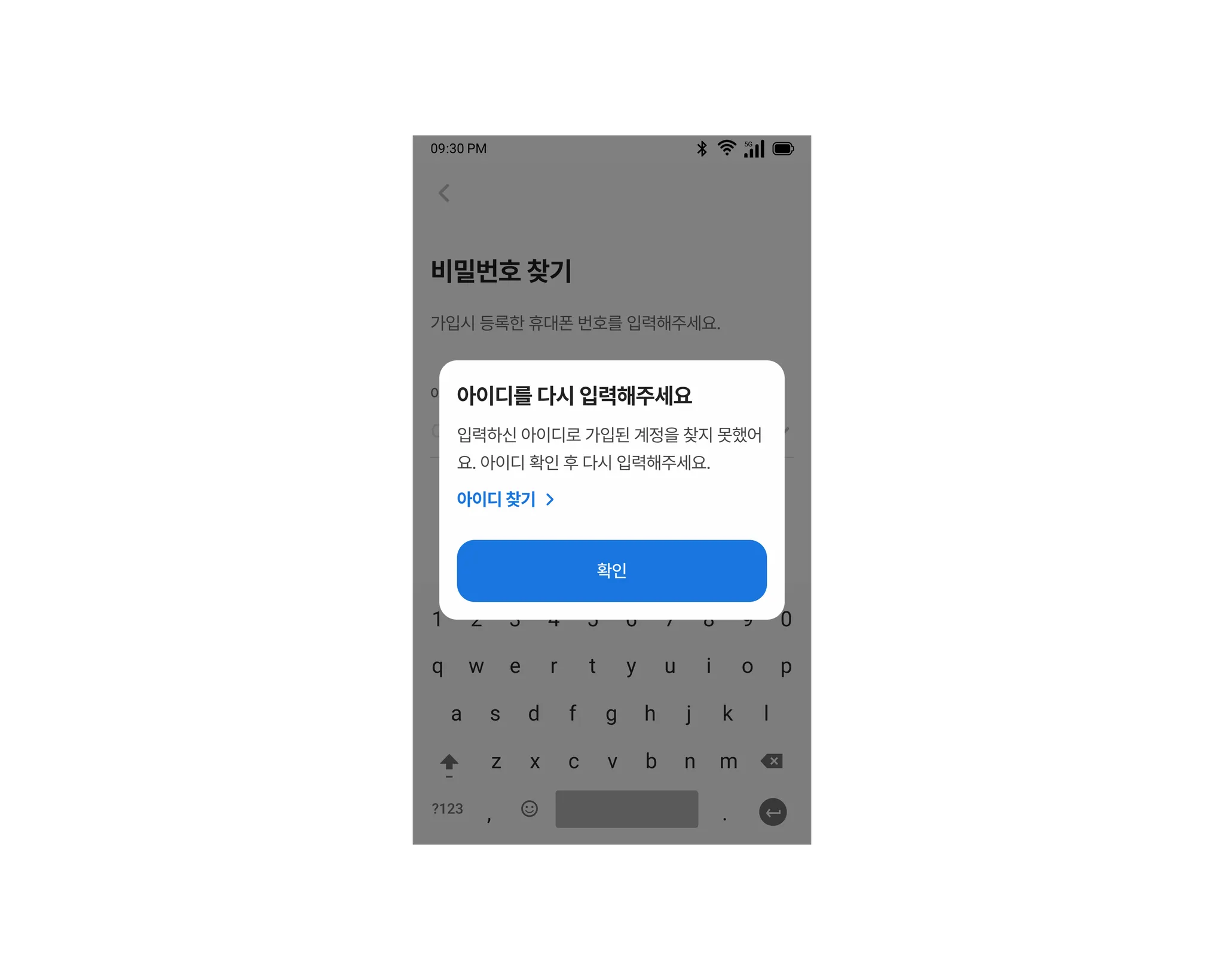 아이디를 입력했는데 다음과 같이 [입력하신 아이디로 가입된 계정을 찾지 못했어요]라는 메시지가 나타났나요?