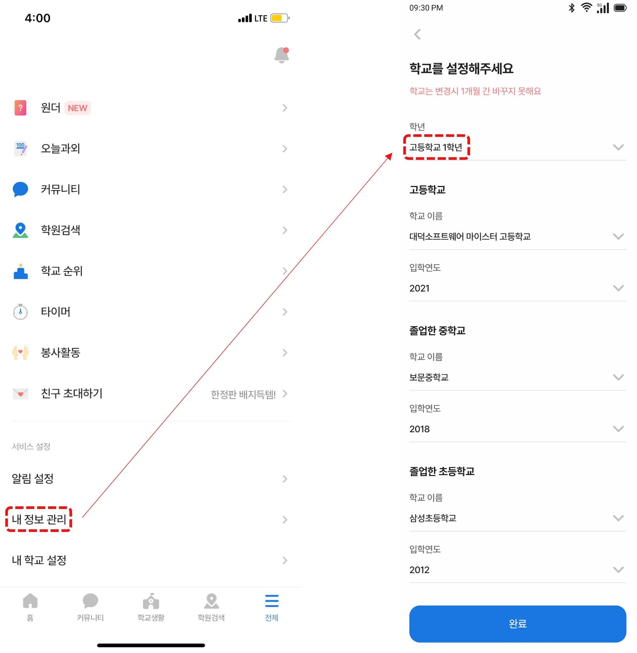 커뮤니티 내학교게시판, 친구 초대, 우리학교 가입자 명단 확인을 위한 학교 설정